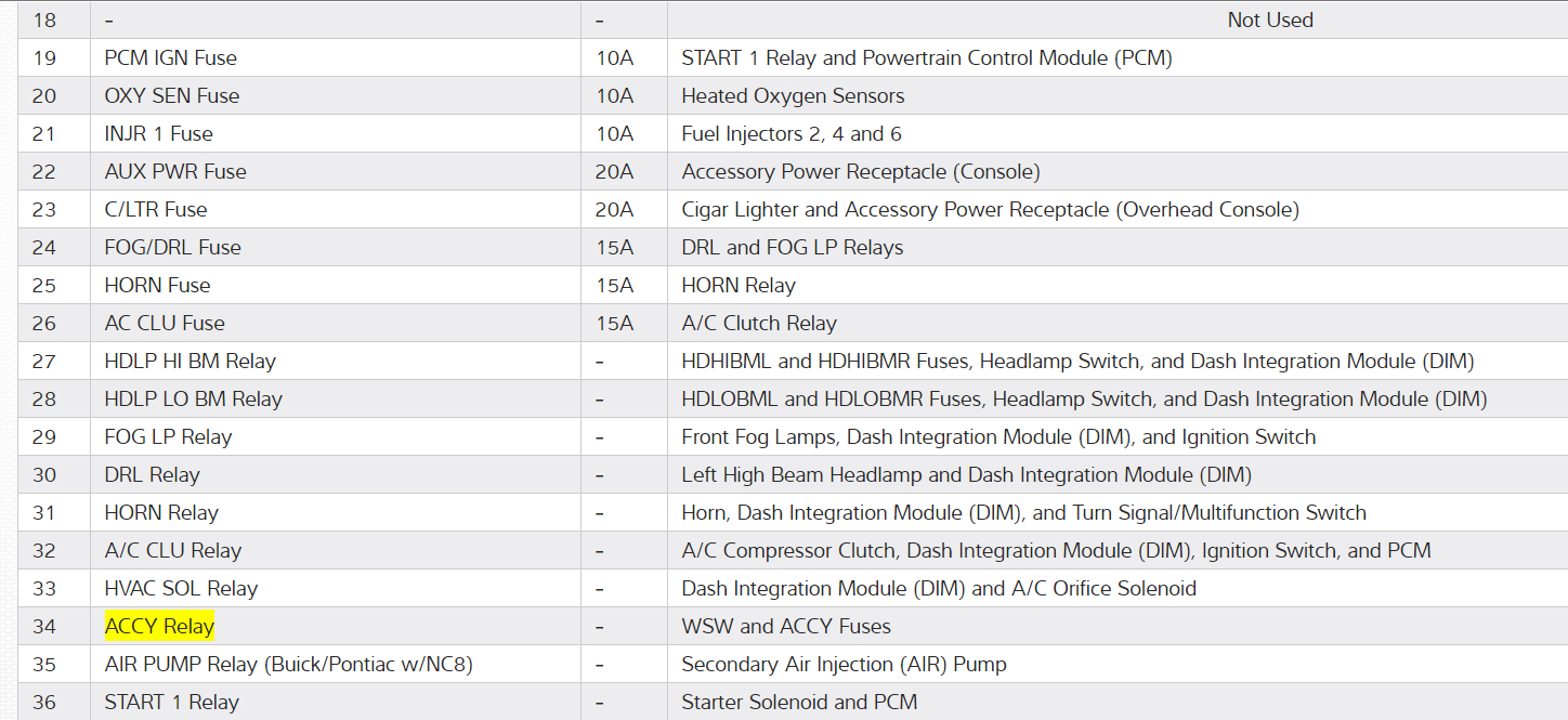 10 - 20 Amp (1987) Fuel Pump Injectors; 10 Amp (1988-89) Cluster, Oil, Compass; 10 Amp (1990-91) Low Coolant, Compass; Blank (1991 SSE Model)