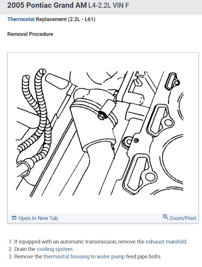 1996 Pontiac Grand Am SE 2.4L Quad 4: Im trying to find the location of the thermostat. Ive gotten a "bible" for the car but I covers a lot of different make and models of cars and so I got confused on the location. Also whats the proceedure on changing it?