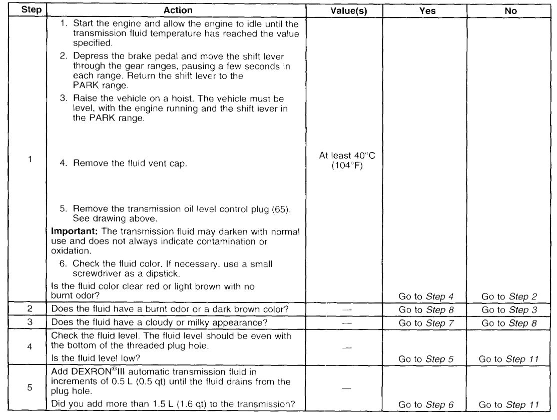 Raise the vehicle on a hoist. The vehicle must be level, with the engine running and the shift lever in the "park" range. Caution: The engine must be running when the transmission fluid fill plug is removed, or excessive fluid loss will occur. The transmission fluid may be hot. Since the actual fluid level is unknown, stand clear when removing the fill plug. Have a container ready to capture any lost fluid. Do not turn the engine off with the fill plug removed, as you can be injured by hot transmission fluid being expelled out of the oil fill opening.