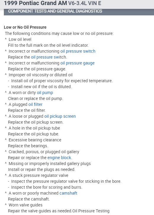 Low oil pressure can be due to a bad oil pump. It can also be due to a clogged oil screen for the pickup tube.