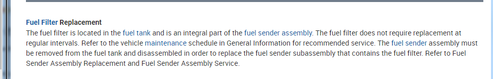 This fuel filter is located in the tank and part of the pump. It only needs to be changed if the pump needs to be removed for another reason. You are not required to change this as regular maintenance.