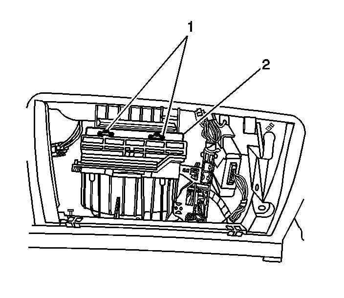 4. Push down on the tabs (1) and open the filter door (2).