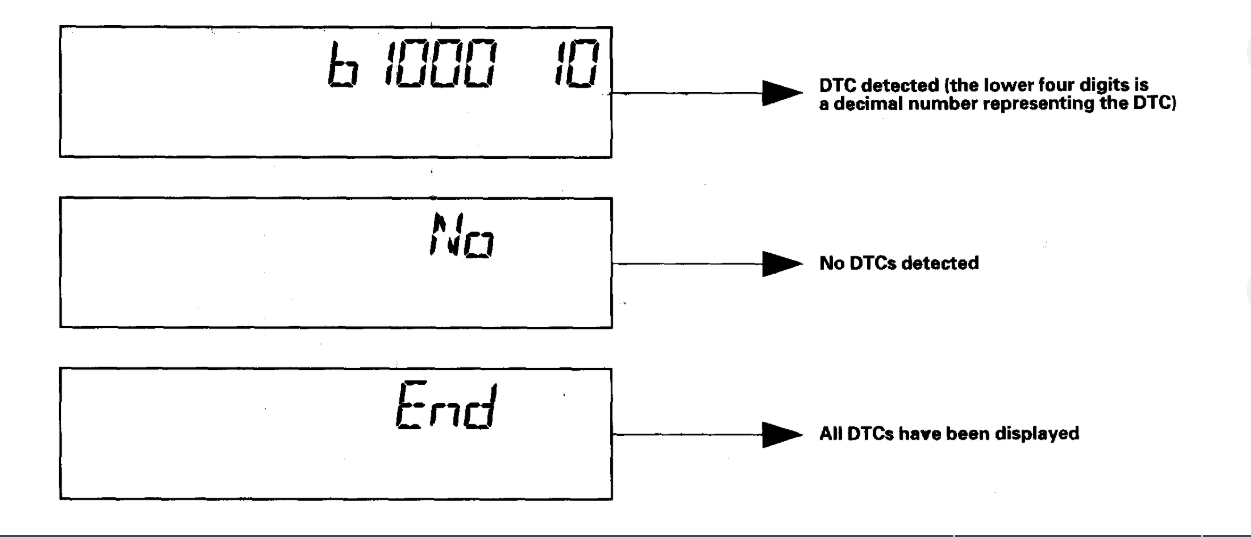 While in Test Mode 1, the DTCs which have been detected and stored individually by various B-CAN (Body-controller Area Network) units, will be shown one by one on the multi-information display when the communication between the Multiplex Integrated Control Unit (MICU) and the gauge control module is normal. To scroll through the DTCs, press the select/reset switch on the gauge control model.