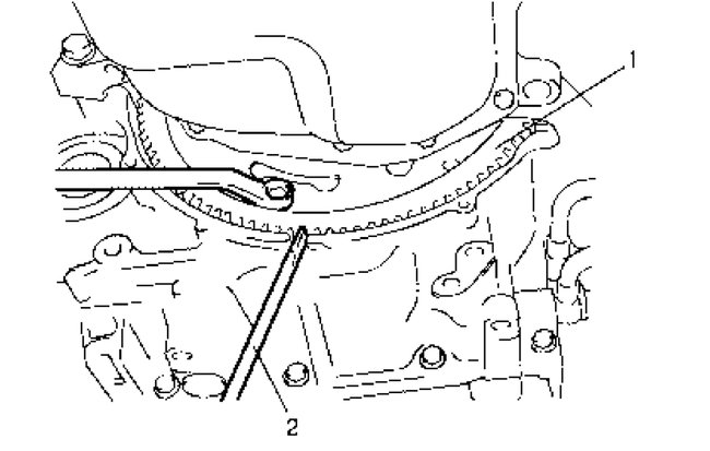 To lock drive plate (1), engage a flat head rod or the like (2) with drive plate gear.