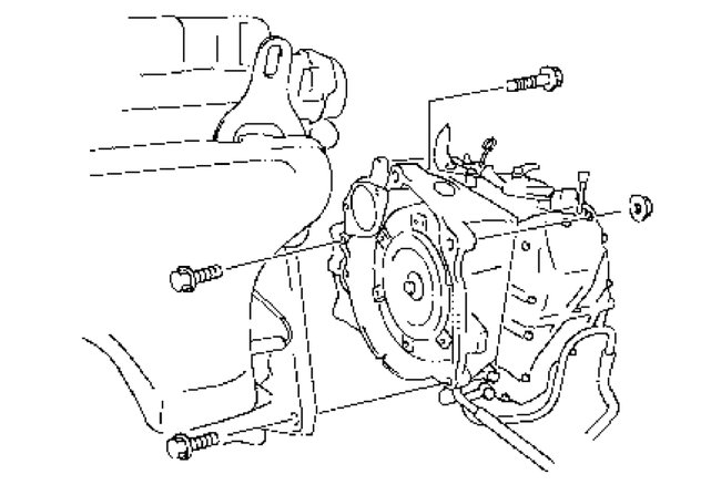 7. Remove bolts and nut fastening engine and transaxle, then detach transaxle from engine.