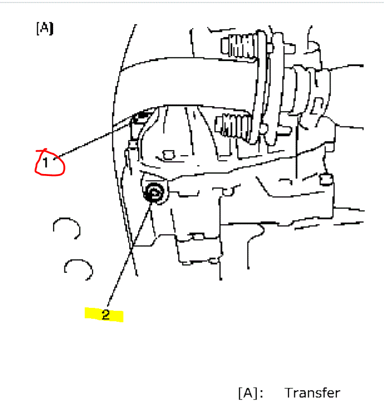 2. When engine is cool, remove drain plug (1) from transaxle housing (2) and drain A/T fluid.