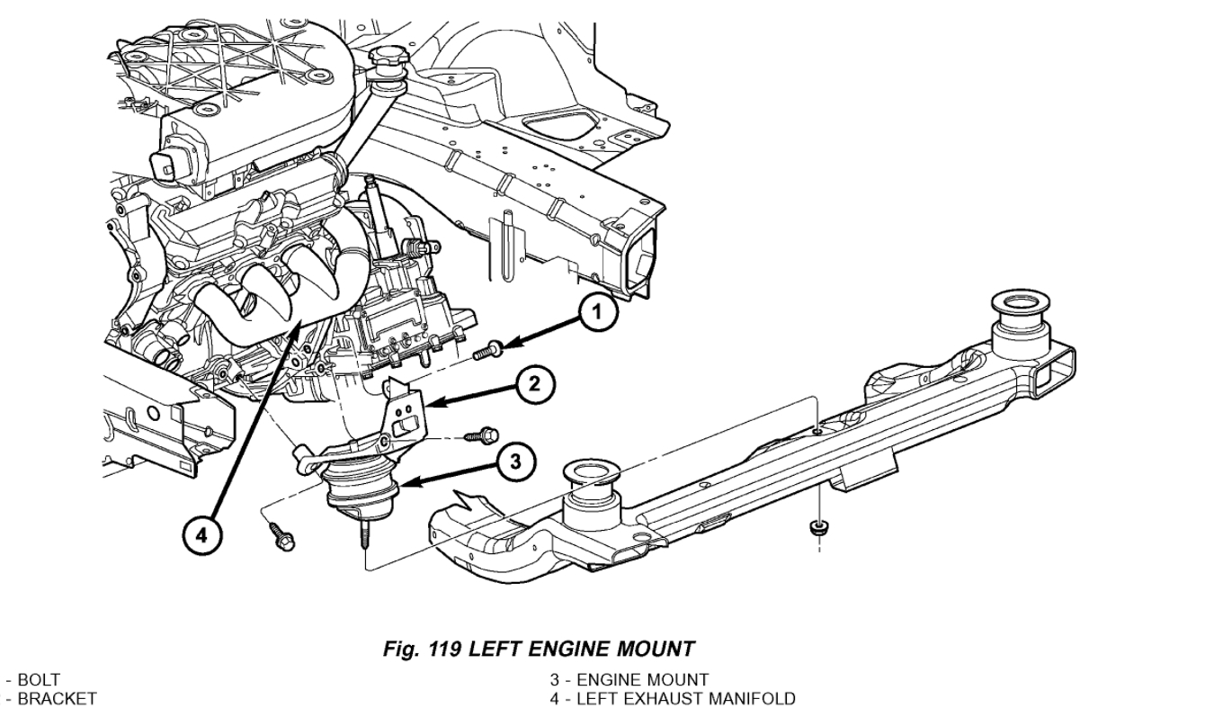8) Remove the engine mount bolts and remove mount (Fig. 119).
