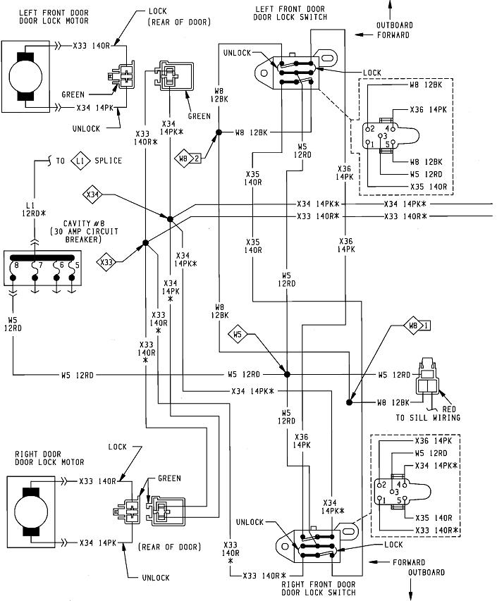 The first diagram is for the complete circuit in an '88 Grand Caravan except for the lock motor for the sliding door. Circuits X34 14PK and X33 14OR at the center, right side go to that lock, and those two wires would be used for both rear lock motors on four-door cars or trucks. This circuit is typical for most car brands and models up to the mid '90s.