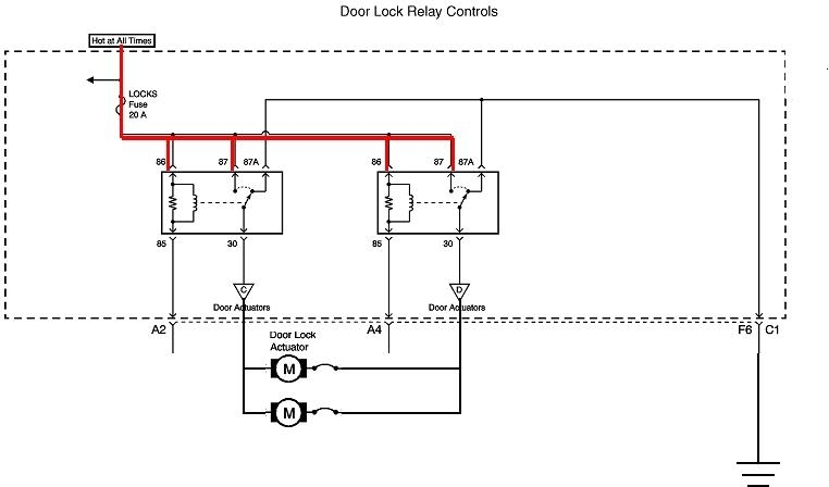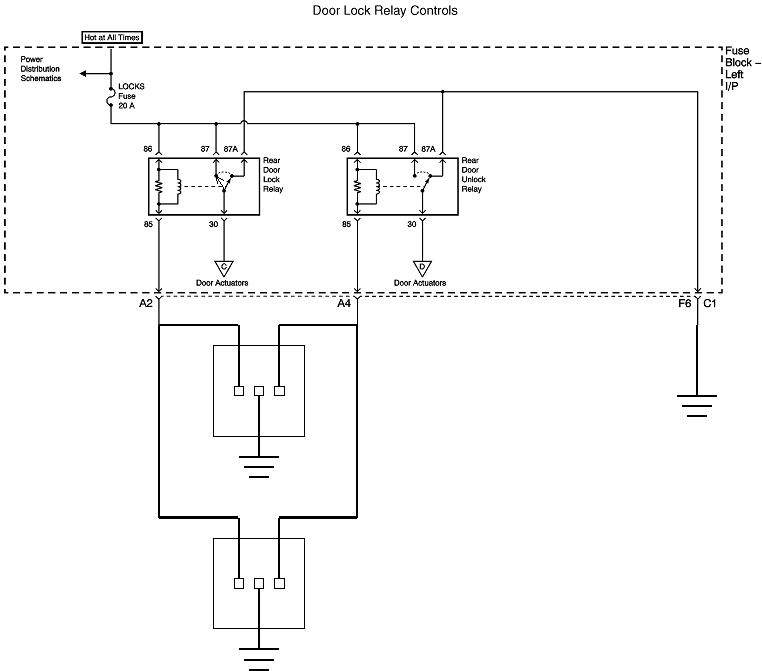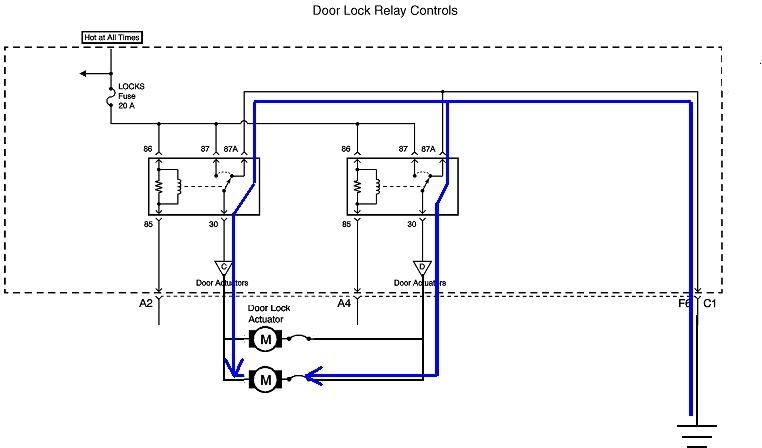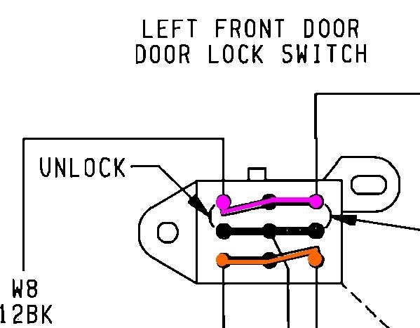 I put together a description of how the older lock systems work. It shows how the door switches are both in the circuit when either one is pressed. This description is rather cumbersome, and it makes more sense when it's explained with an overhead projector, but see if you can get something useful out of it.