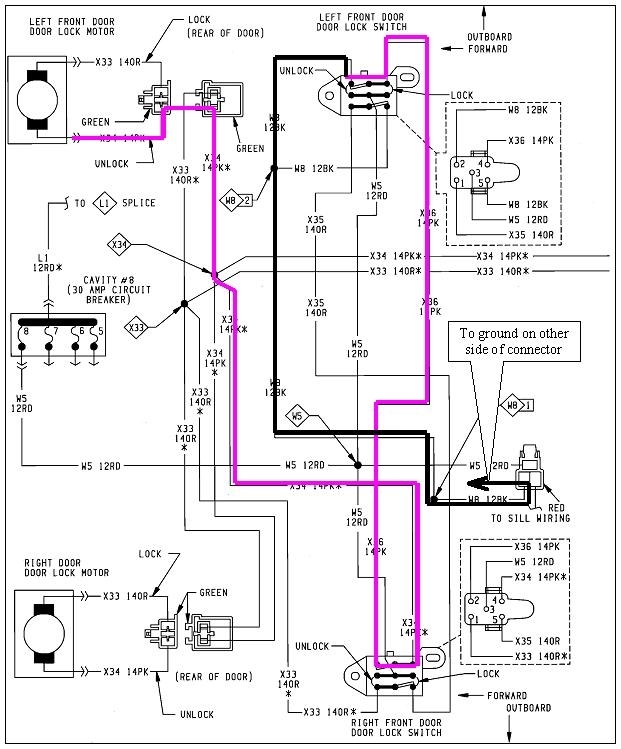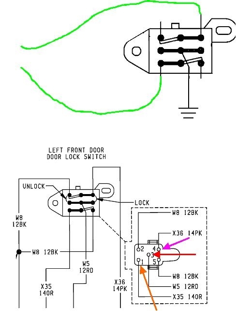 The other half of the circuit works the same way. In the fifth diagram, it is outlined with the pink lines. The point is everything has continuity to ground. A quick test is to unplug the lock motor, then measure from each wire in that plug, to ground, and you should find very low resistance. If you find an open circuit, there is a bad contact in one of the switches or a break in one of the connecting wires. Between these two circuits, there are a total of four contacts in use when both switches are released. This is why a defective switch can be the one that seems to operate the locks properly.