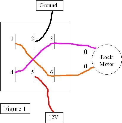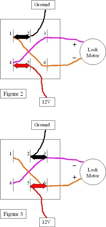 The switch you need has three positions with the center-off spring-loaded to stay in that position. When not being pressed, there's no connections between any terminals. When you do press it one way, the connections are as shown in Figure 2. 12 volts is applied to the pink wire on the lock motor and ground is connected to the orange wire. When the switch is pressed the other way, as in Figure 3, the pink wire is grounded and 12 volts is applied to the orange wire. The polarity is reversed at the lock motor.