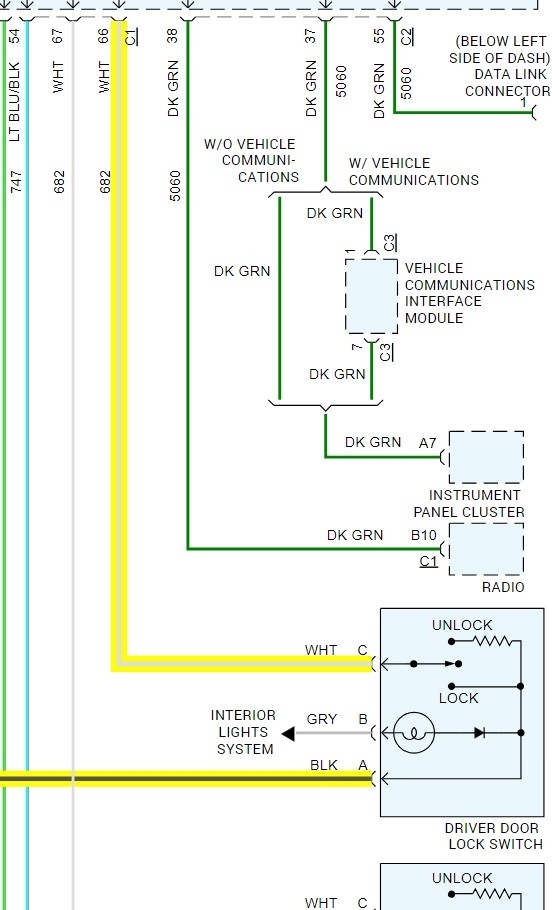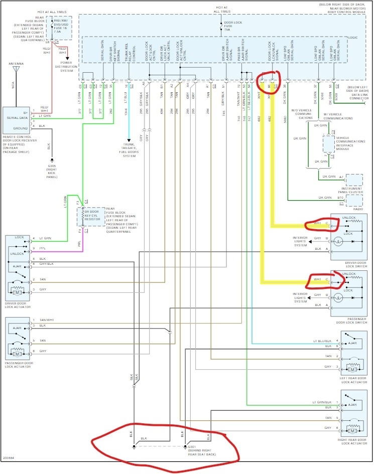 Okay, so the power lock mechanism works but not the door switches. It looks like the switches only share two items. The ground connection and the body control module itself. To check which is the issue we can test right at either switch. Let's use the passenger side as it gives us a bit more room without the steering wheel in the way. Use a trim tool with a wide flat blade (butter knife or similar will work) and look at the trim piece that the door lock button is in. Use the trim tool to slip under the front edge of the trim and find the release tab for the trim piece. Release it and the trim should rotate out of the door panel. There will be a connector on the switch with a few wires in it. The ones you are looking for are the white and black ones. To test if it is the module we need a grounded piece of wire. Unplug the connector and touch the piece of wire to the terminal that goes to the white wire, with the key on. If the door locks trigger when grounded the issue is most likely the ground connection. If they do nothing it could be the body module. To test that plug the connector back into the switch. Now look at the spot where the black wire comes out of the connector. Use a pin to back probe that connection. You want to use the needle to push into the connector and then connect the grounded wire to the pin. Now try the switch. Do the locks now work? If yes, then go find the ground connections contact point at G301 which is behind the rear seat back and repair it. Or run a bypass ground by finding the black wire where it comes out of the door harness at the A pillar and adding a ground there. If the initial testing shows that the BCM is faulty and not the ground connection, then you will need to replace it. However, to replace it you will need a factory level scan tool and access to GMs programming software. Then you need to pull the build data from the existing BCM and load that into the replacement.