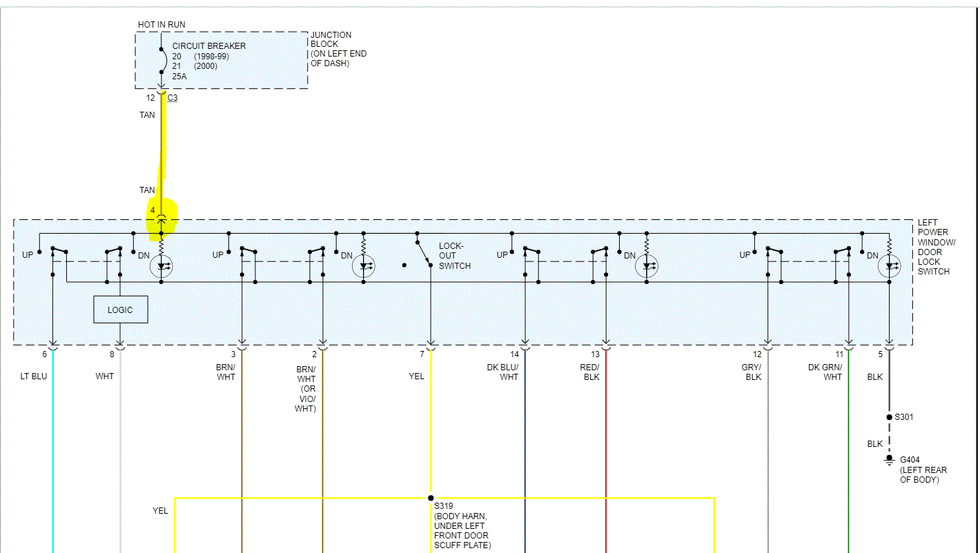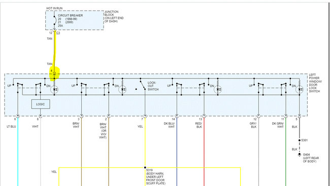 I suspect that something is loose in the main switch wiring or the ground in the door. If you look at pic 1, it shows a tan wire to the main switch (driver's door) which basically sends power to all switches and windows. I need you first to confirm there is nothing loose on the connector. If everything appears good, then disconnect the connector on the main switch, locate the tan wire, and see if power is available from the tan wire in the pic.
