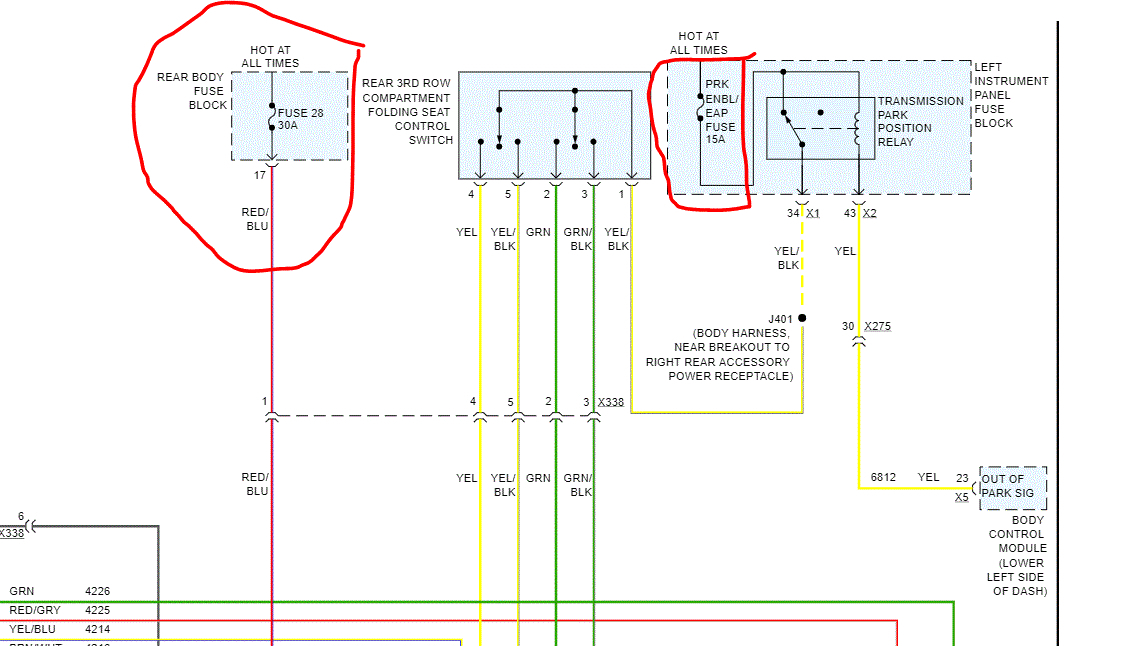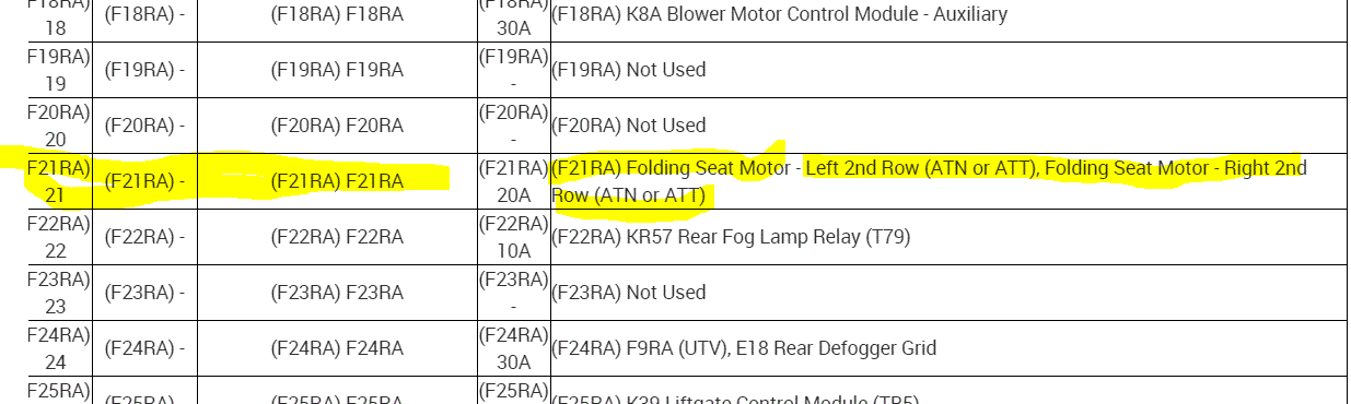 Also, if you look at pic 2, it is related to the third seat. There are two additional fuses to check. Fuse 28 isn't related to the second row seating, so I suspect it isn't the issue. However, the park enable fuse in the vehicle which I circled is. Check that one as well.