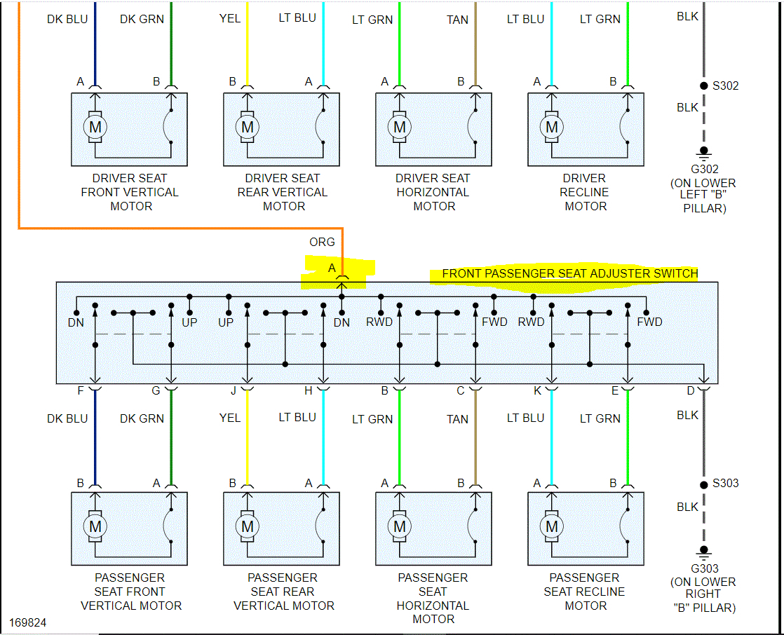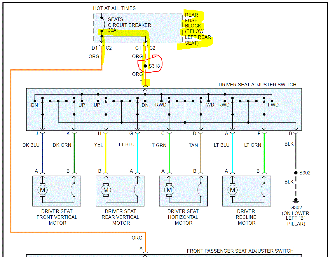 Also, I attached the wiring schematic below for the power seats. I highlighted and circled places to check for power. I had to cut the pic in half to make it readable, but I did overlap them so you can follow from one to the next.