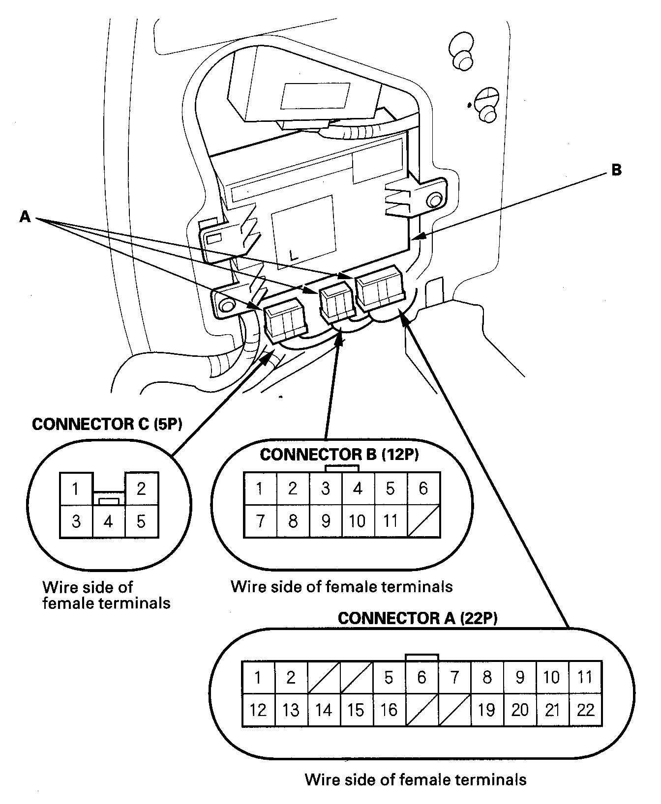 3. Disconnect the 22P, 12P, and 5P connectors (A) from the left power sliding door control unit (B).