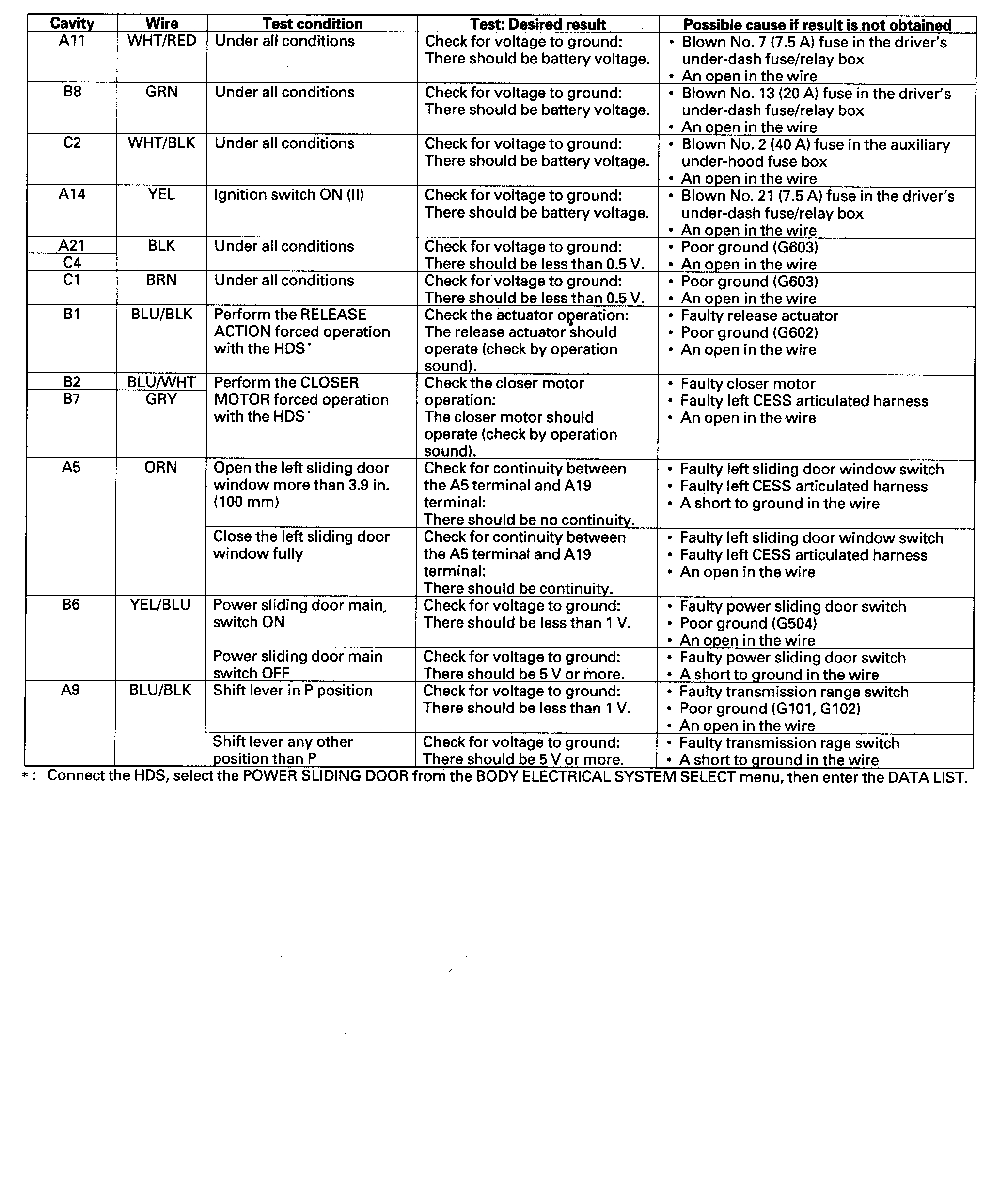 5. Reconnect all connectors to the left power sliding door control unit, and make these input tests at the appropriate connector.