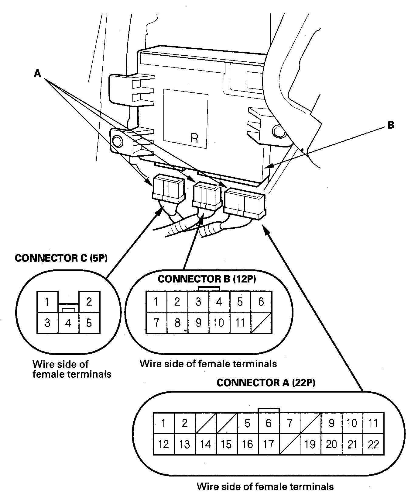 3. Disconnect the 22P, 12P, and 5P connectors (A) from the right power sliding door control unit (B).