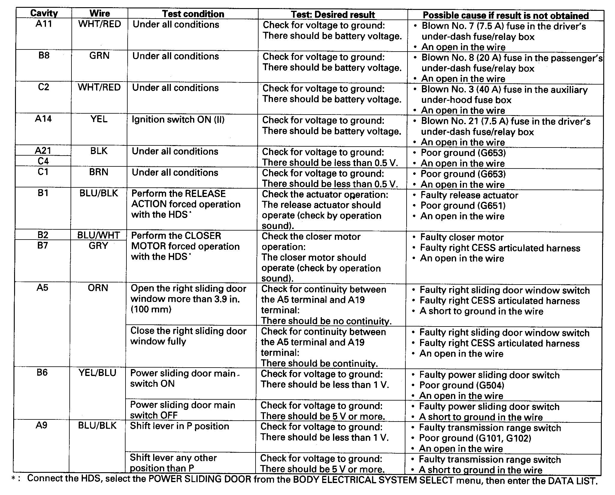 5. Reconnect all connectors to the right power sliding door control unit, and make these input tests at the appropriate connector.