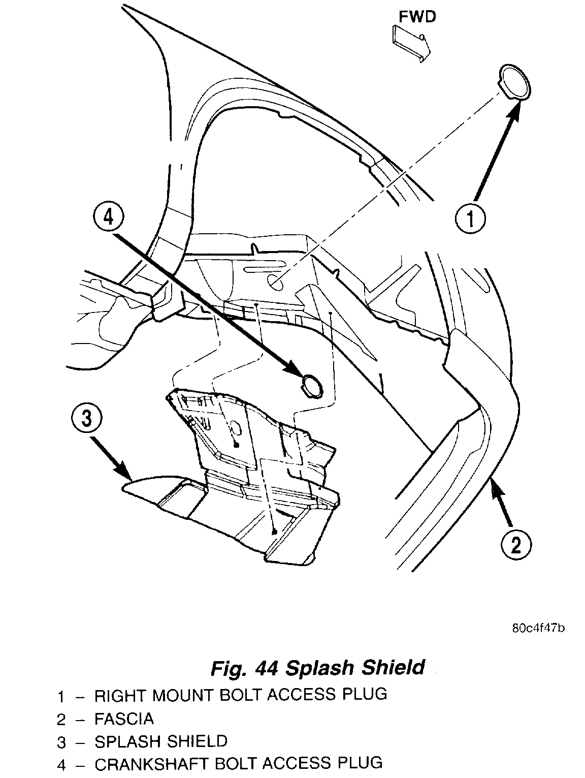 2. Using a wrench, rotate belt tensioner clockwise (Fig. 45) until belt can be installed onto power steering pulley. Release spring tension onto belt.