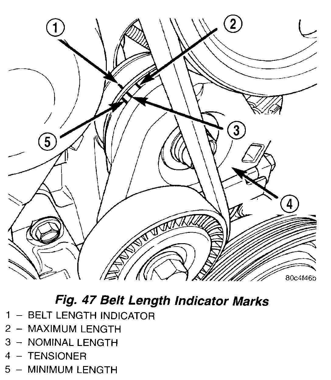 3. After belt is installed, inspect belt length indicator marks (Fig. 47). The indicator mark should be within the minimum belt length and maximum belt length marks. On a new belt, the indicator mark should align approximately with the nominal belt length mark.