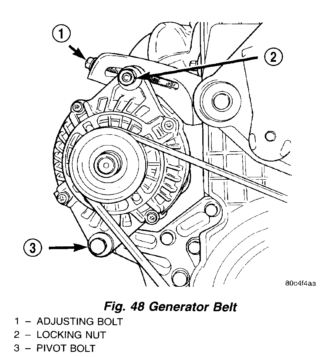 1. Install belt (Fig. 46) over all pulleys except for the power steering pump pulley.