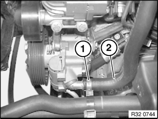 Release hose clamp (1) and detach intake pipe (2) from vane pump.