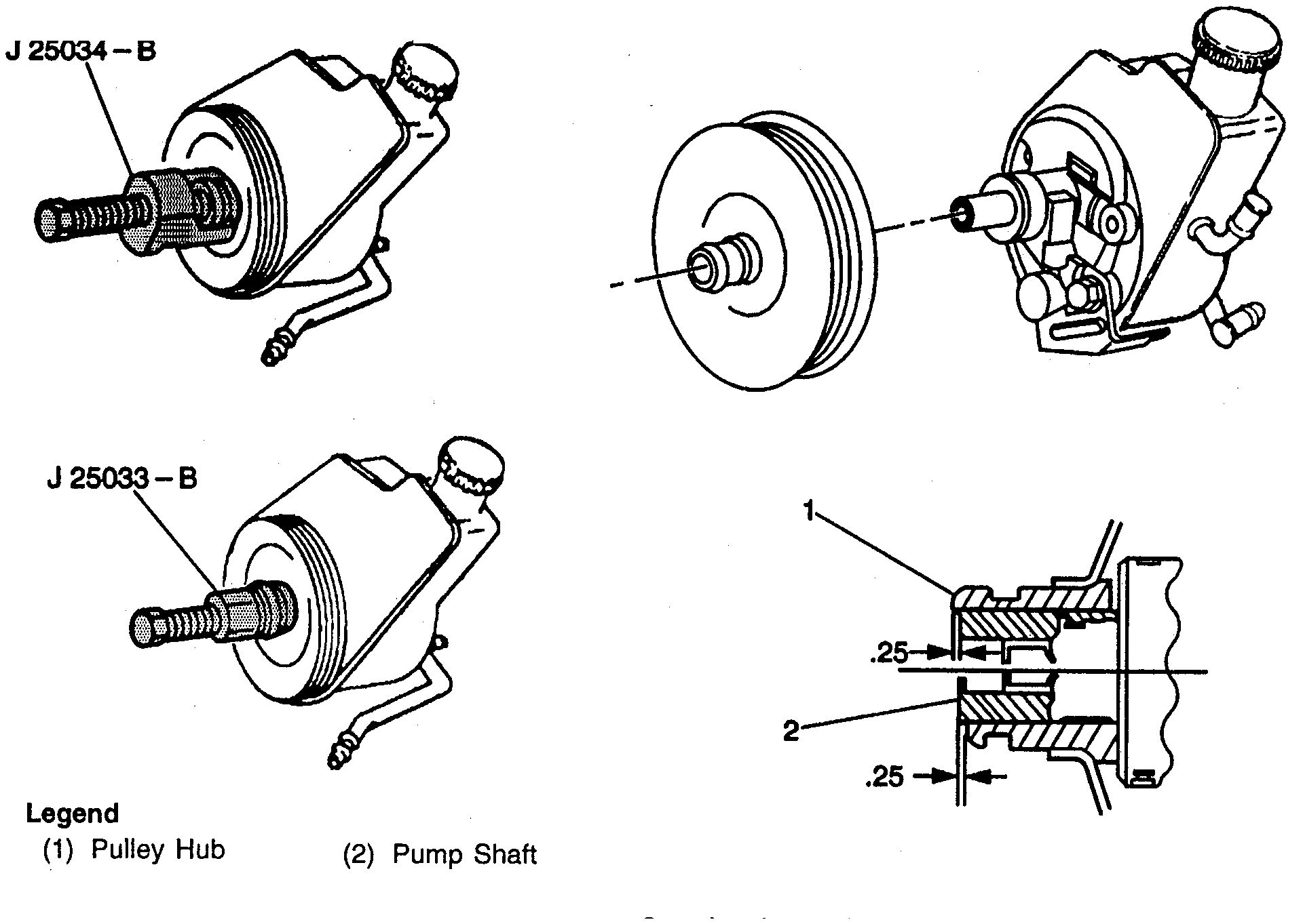 - Install pulley flush +/- 0.25 mm (0.010 inch) with the end of the power steering pump shaft.