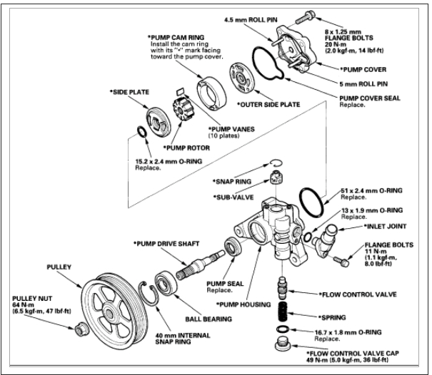 Cover the auto-tensioner, alternator, and A/C compressor with several shop towels to protect if from spilled power steering fluid. Disconnect the pump inlet hose (C) and pump outlet hose (D) from the pump (E), and plug them. Take care not to spill the fluid on the body or parts. Wipe off any spilled fluid at once. Do not turn the steering wheel with the pump removed.