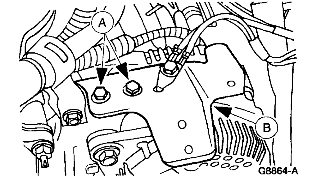4. Remove the (A) bolts and position the (B) power steering pressure hose support bracket aside.