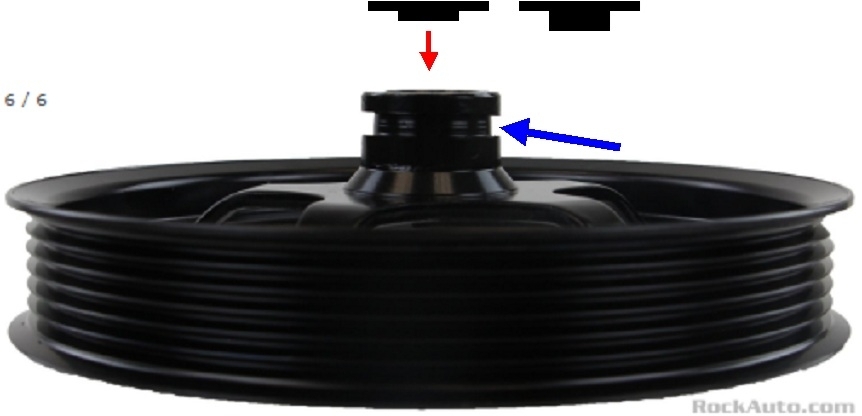 The next issue is when you push the pulley onto the new pump, how far you push it on is critical. 1/16" too much or too little can set up a miserable belt squeal. Rebuilt pumps often come with a bolt that threads into the shaft's center hole, and a nut and washer to run the pulley on. While they do work once or twice, you still need that special tool set to remove the pulley and to pull it back out if you press it on too far.
