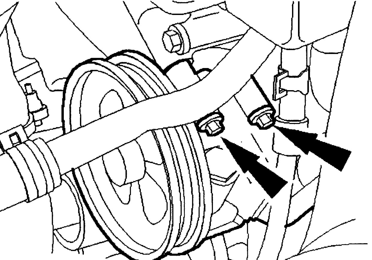 Now you need to get under the car and remove the low-pressure hose to the Power Steering pump. With it off you unbolt the A/C compressor so you can move it aside, you don't need to disconnect the lines just unbolt it for access. Then remove the two lower Power Steering pump bolts. Now move back topside. Disconnect the A/C wiring harness for more room. Then unbolt the coolant tube and move it out of the way, now you can access the two upper Power Steering pump bolts. Remove those and you can remove the pump. Bolt sizes will vary with each application. A common metric set should handle the job though.