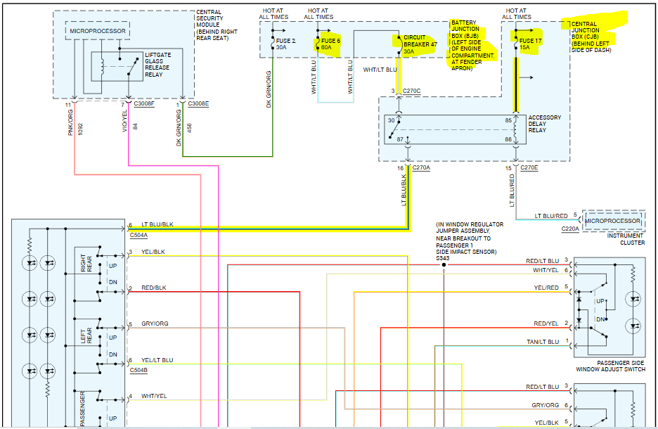 There are a couple of fuses/circuit breakers I need checked. I attached the wiring schematic below for your reference. It appears power comes to the switches from the circuit breaker 47 via the accessory delay relay.