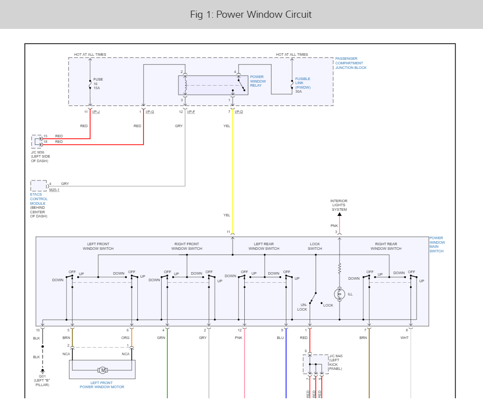 Not getting any power to master window switch. I have a used/new junction box under the dash. Fuse is good, relay is good, checked the continuity of all the wires to test for a break in one (even in door jam) and those all checked out good. Not sure what step to take next.