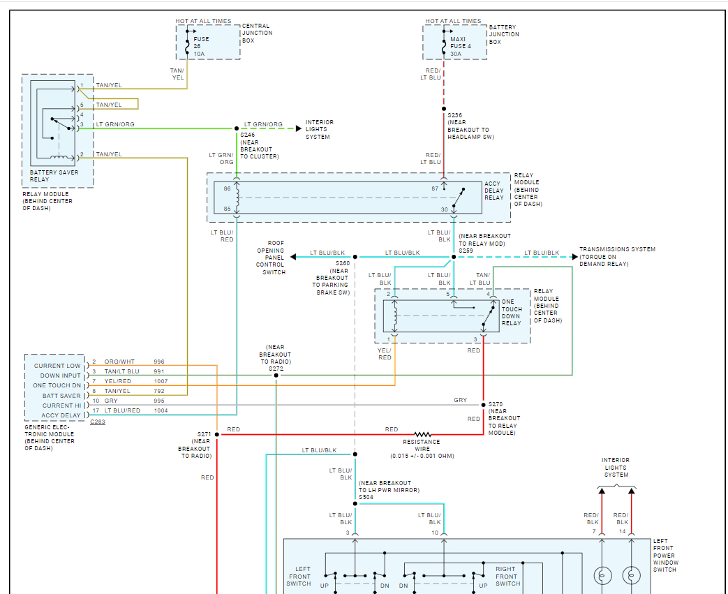 I have no power to the window switches or power to the wiring door plug it is the type that connects them. Interior fuse #25 was blown fuse #26 is ok. I installed another fuse in 25 and it blew right away with a slight smell of burning wire. The under hood #4 power window fuse 30amp is ok. From what I have been reading it might be the battery-saver relay or the GEM relay. And for the best of me, I can seem to locate them I have the radio and the entire front part of the dash off this is a 2000 2-wheel drive Ford Explorer sport.