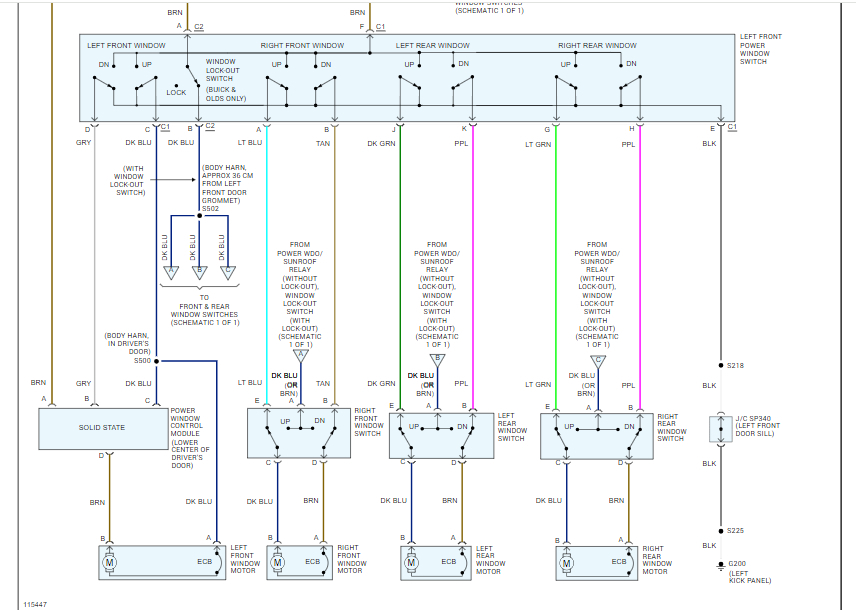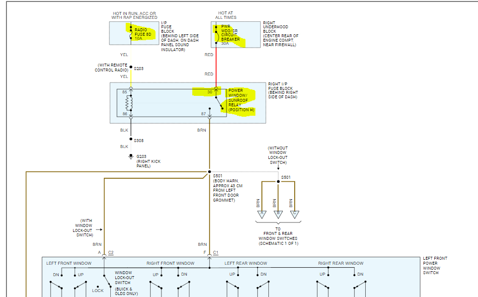 To get you started, I attached the wiring schematic below. Also, there is a power window relay that is involved here as well as a circuit breaker and a traditional fuse.