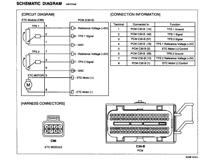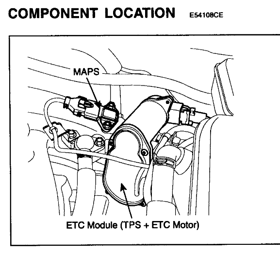 The Electronic Throttle Control (ETC) system is made of the components throttle body, Throttle Position Sensor (TPS) 1 & 2 and Accelerator Position Sensor (APS) 1 & 2. TPS 1 & 2 are sharing the same source voltage and ground The throttle valve opening is control by throttle motor which is controlled by Engine Control Module (ECM). The opposite position indicator shows inverted signal characteristics. TPS 1 output voltage increases smoothly in proportion with the throttle valve opening angle after starting. TPS 2 output voltage decreases in inverse proportion with the throttle valve opening angle after starting. TPS provides feedback to the ECM to control the throttle motor in order to control the throttle valve opening angle properly in response to the driving condition.(Check pic1)