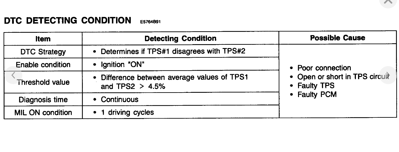 Checking output signals from TPS 1 and 2 under detecting condition, if output signals difference between TPS 1 and TP S2 are detected more than 4.5% for the specified number of times, PCM sets P2135. And then MIL (Malfunction Indication Lamp) turns on.(Check pic2)
