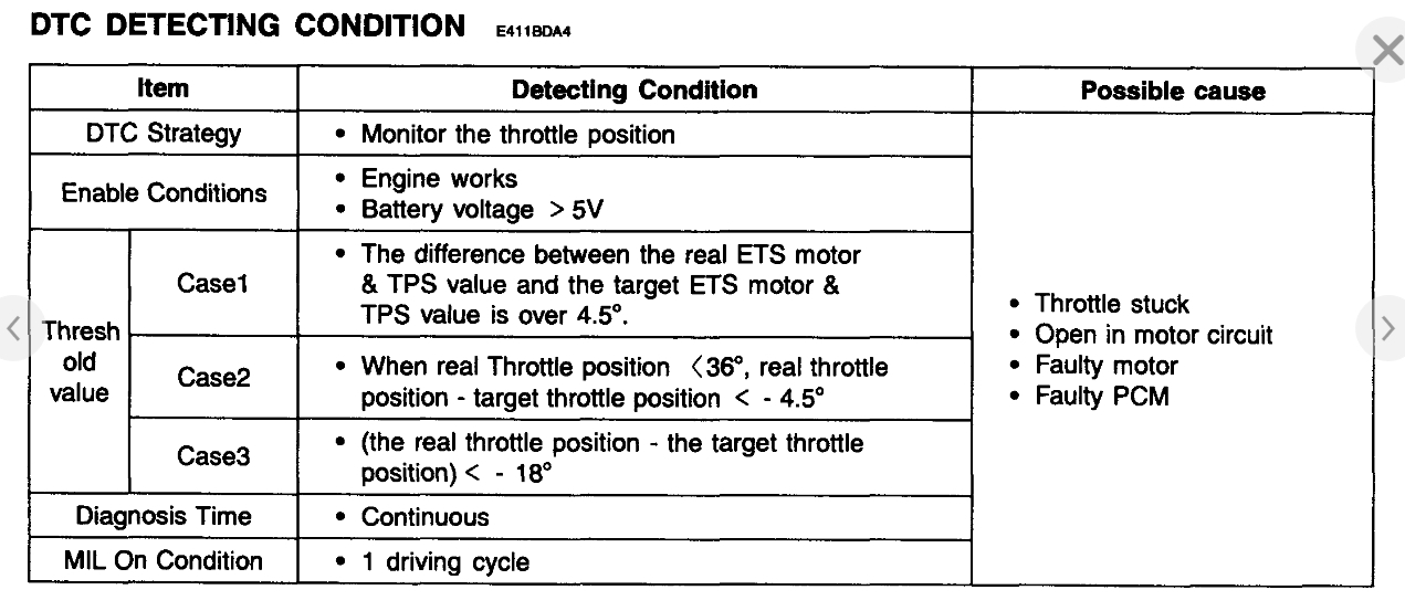 Checking output signals from TPS under detecting condition, if the difference between real and target throttle position is above the specified value, PCM sets P0638 and then MIL (Malfunction Indication Lamp) turns on.(Pic6)