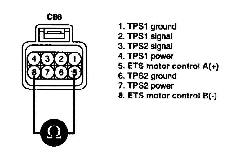 4. Measure the resistance between terminal 8 of ETS motor & TPS harness connector and terminal 1 of PCM harness connector.