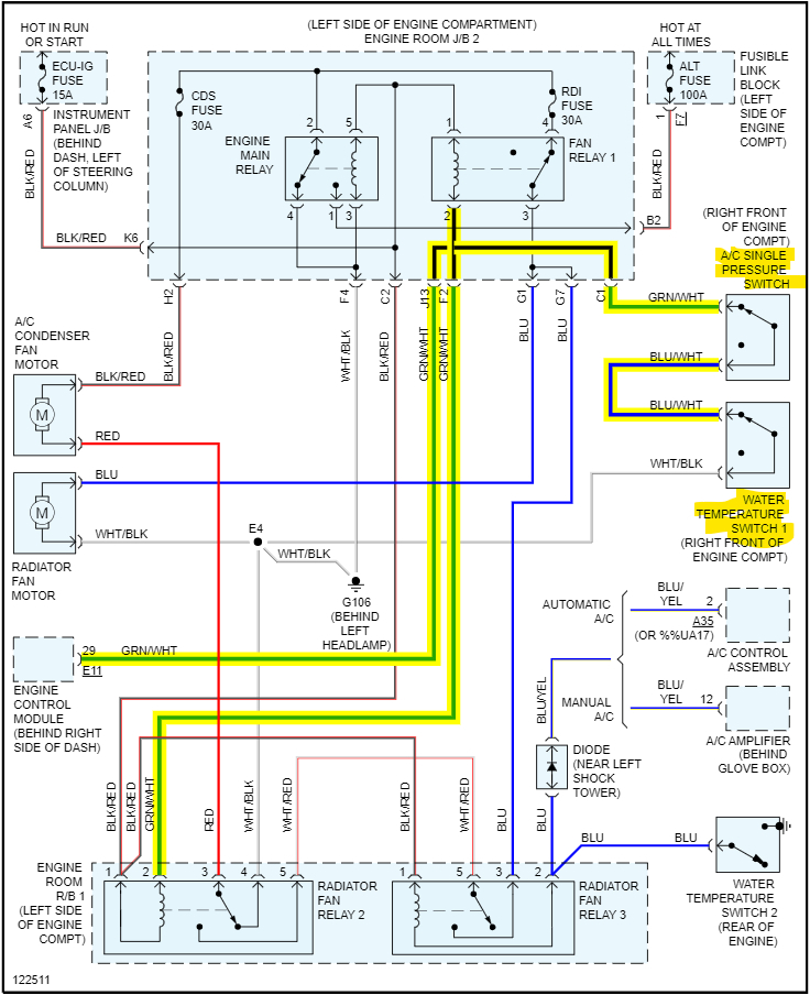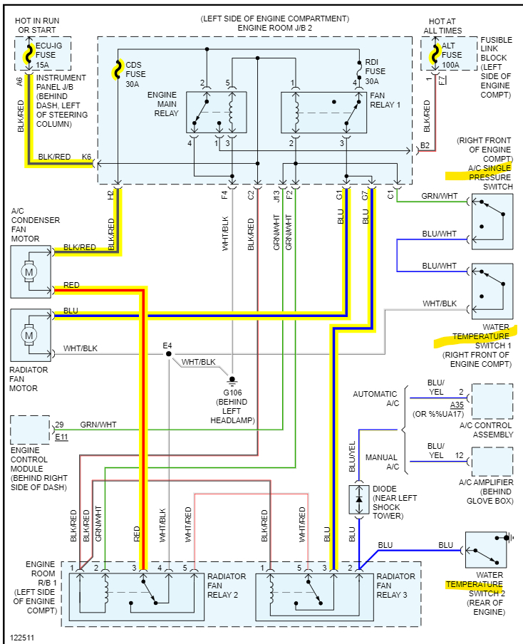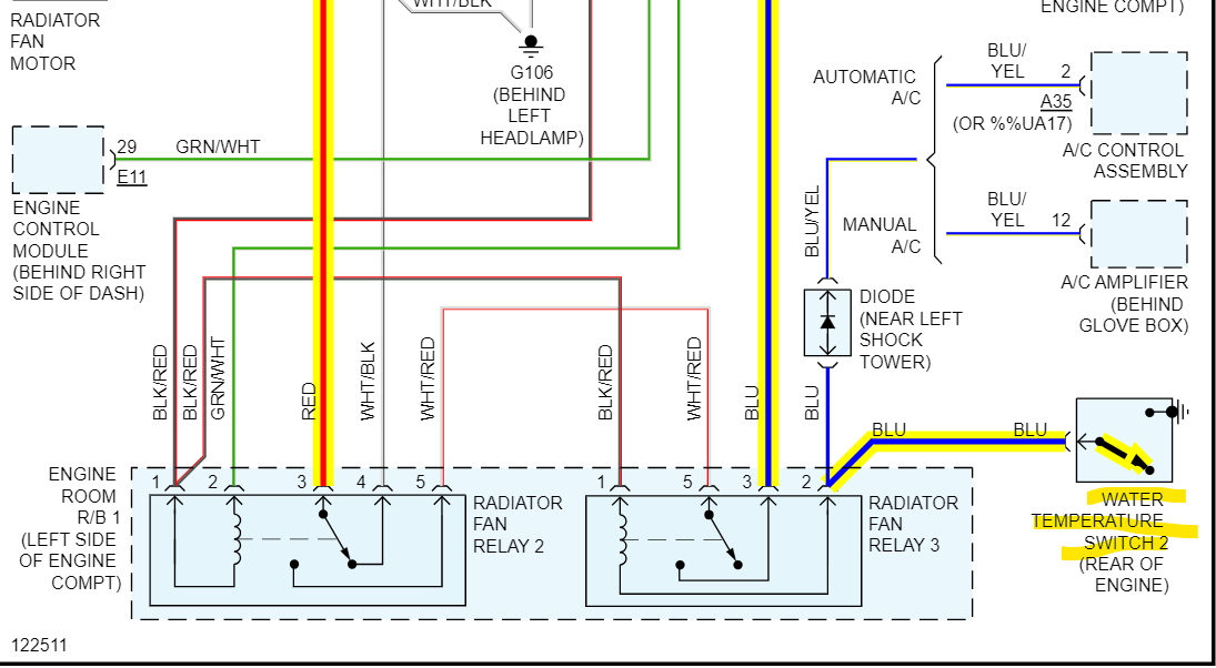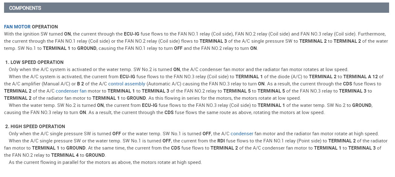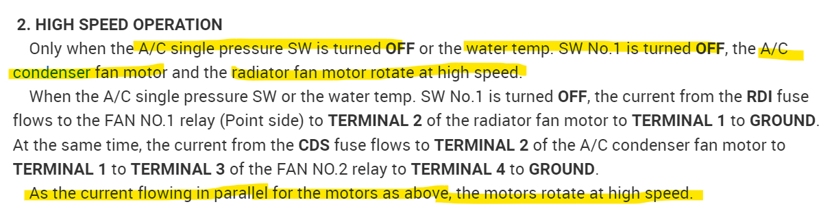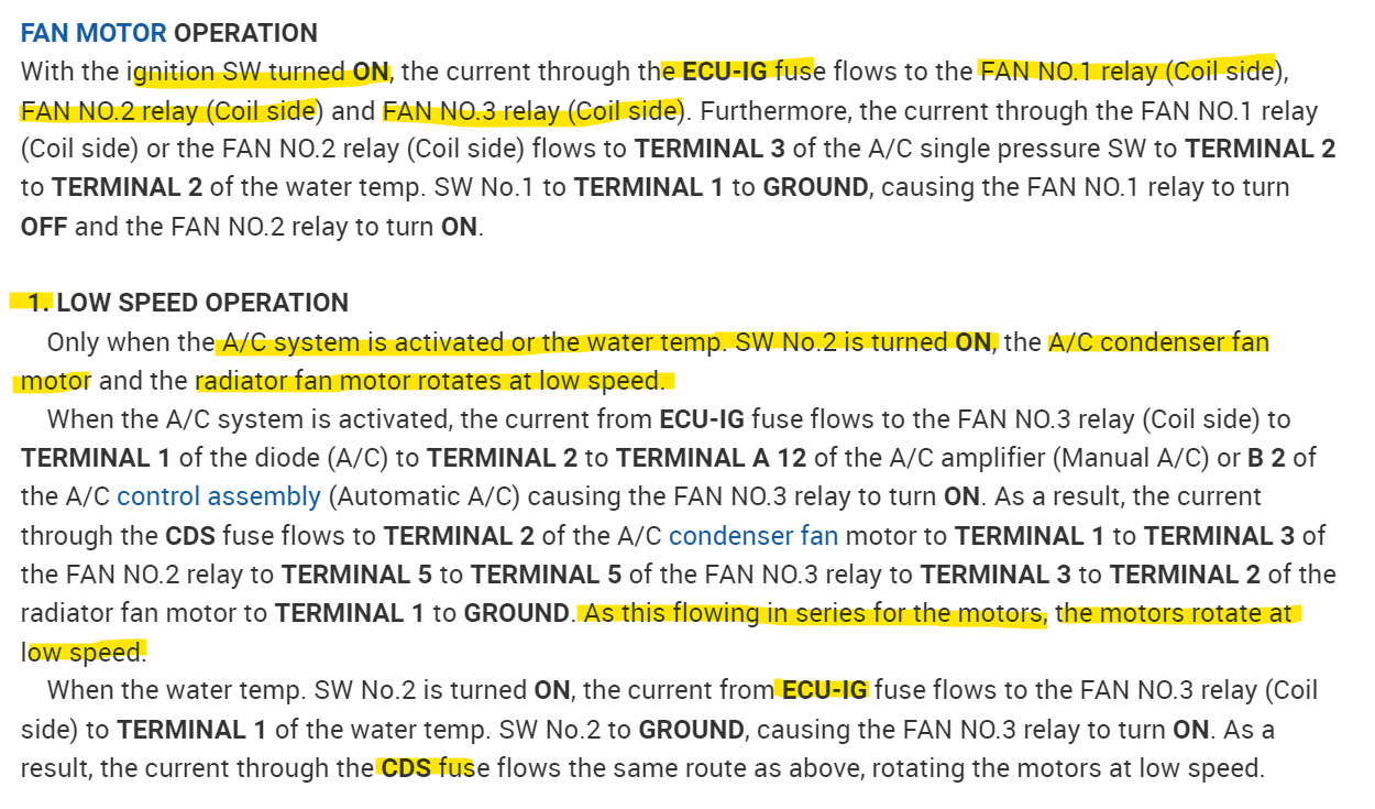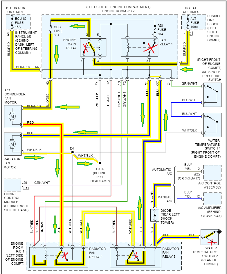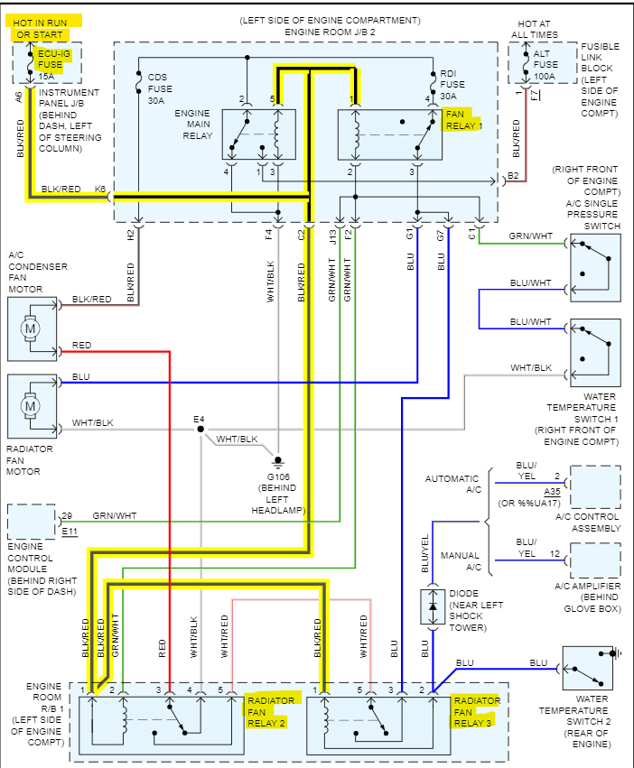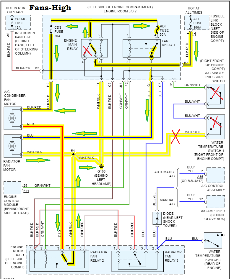 The diagrams below are for the fan circuits and operation. Since there are 3 relays for the fans, I took the time to mark out which way there is current flowing for Low and High speed. The 3rd diagram is the Key On power to the relays, the 4th is the low speed for both fans, which are run in a series circuit which gives it the low speed. The 5th is each fan in a Parallel circuit, so each fan is getting direct 12-volts instead of the series circuit where the voltage is shared between the 2 fans one after the other. I'm not sure which relay you jumped out to get them working. But there are a number of components that could be at fault. It might just be a bad relay. But the diagrams show which fuses power the fans.