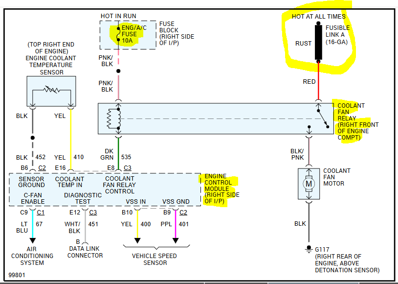 I attached the wiring schematic for the fan. First, confirm there is power to and from the AC/Eng fuse on the right side fuse panel inside the vehicle. If that checks good, we need to go to the relay and confirm power is always present on either pin 87 or 30. One of the two will have power at all times. If they don't, then we likely have a bad fusible link.