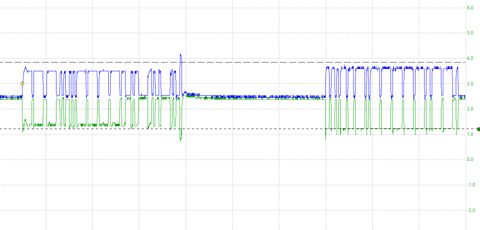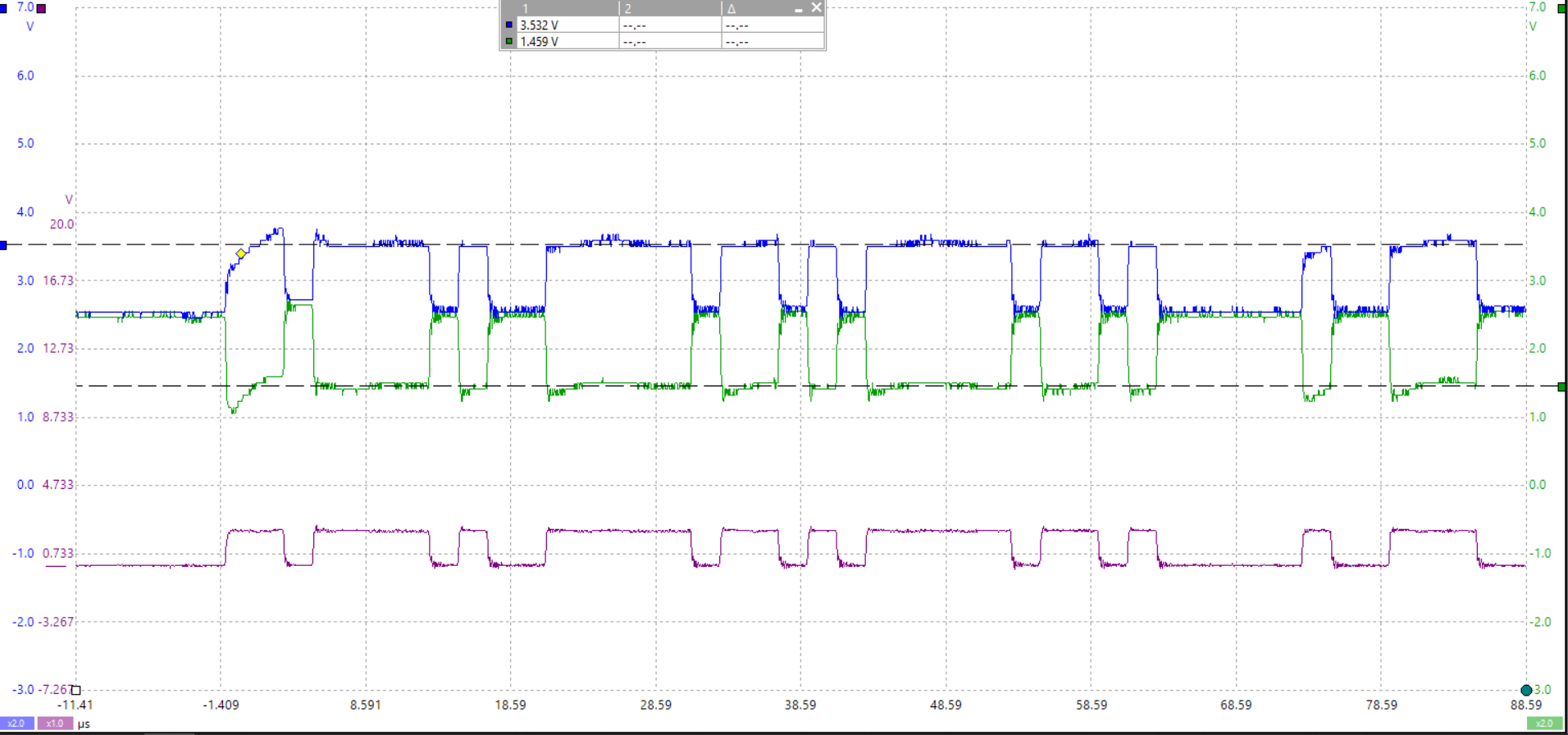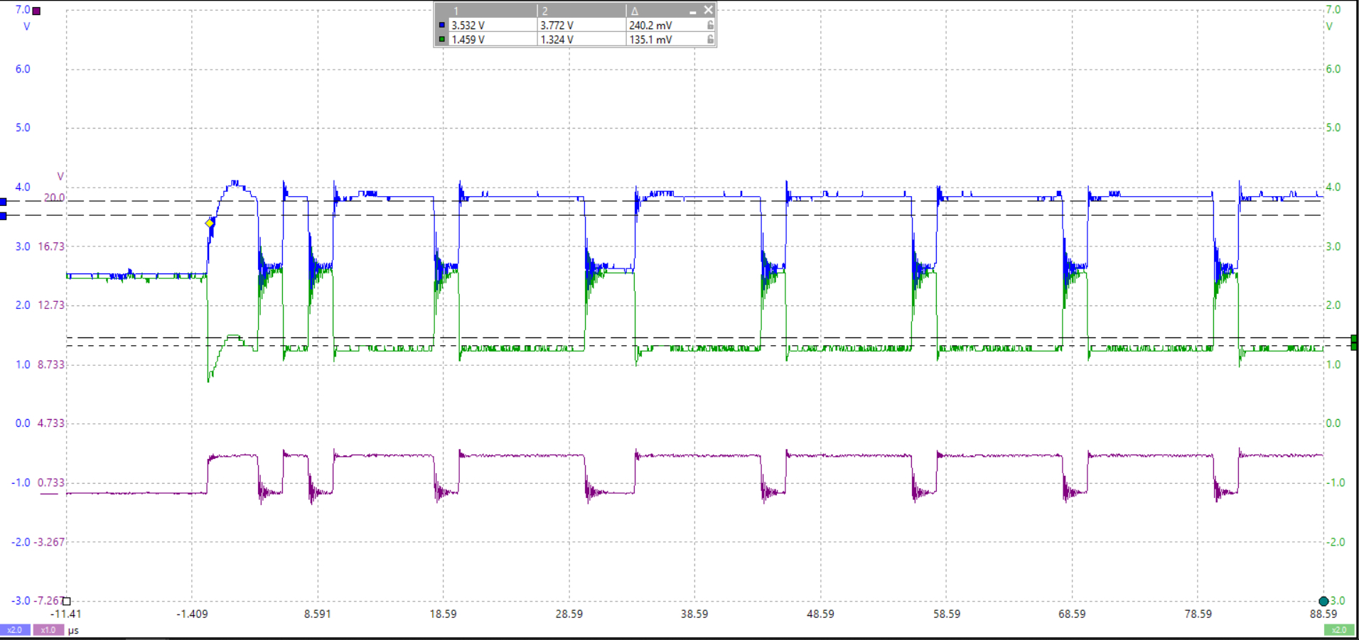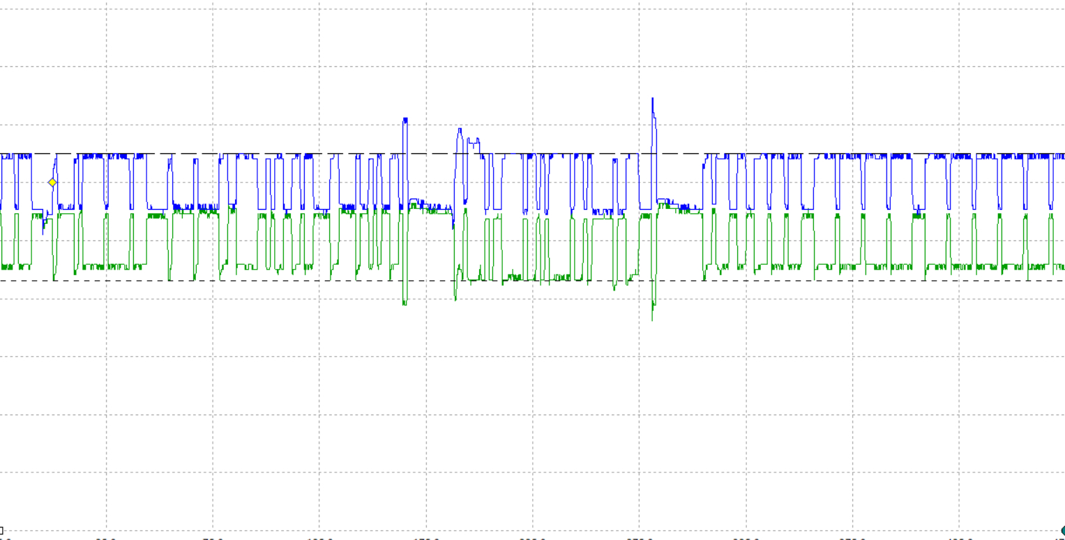 the 2nd one is a vehicle I did some engine work on and noticed some codes setting during my prescan so I scope the bus to see what it looked like, ignore the purple waveform at the bottom, that's a math channel, the Blue is the Can High signal and the green is the Can Low, right off the bat, you can see a sloping waveform, but this is only the beginning section of one message. You can see the same effect in the 3rd waveform.