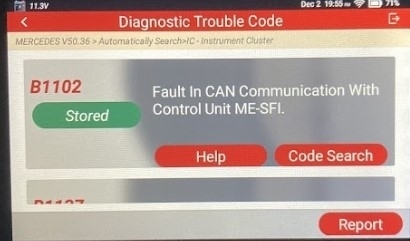 The fact that you may not even have the correct ECM now is going to make things more difficult, but the vehicle runs, this code B1102 (and I don't know if that code number is correct or not) regardless, it's the Instrument Cluster complaining that it cannot communicate with the ECM. It does say if it's a Current or Historic code, but the Instrument Cluster is on the "Engine" Can Bus network along with the ECM (ME-SFI) which makes sense, since it's the Fan running on high that is the complaint right now, but the rest of the communication codes could all be related,