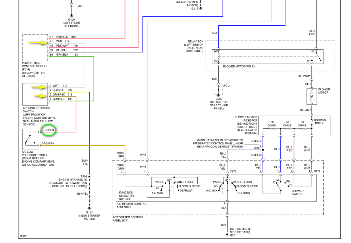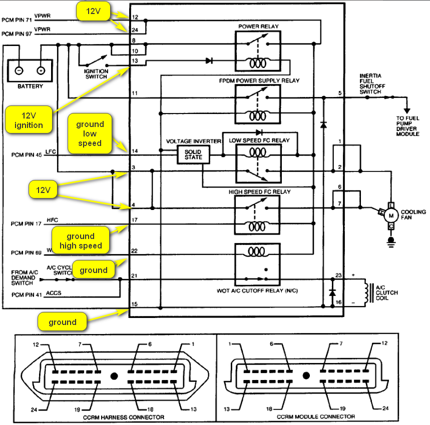 I have consulted the diagram you have supplied and marked the pins I believe are responsible for the cooling fan activation.