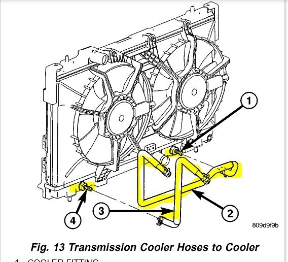 Next, did the hose just fall off or did the coupler that holds the trans cooling line break? If it broke, then it will need replaced. If it simply fell off, then the original radiator should be fine. I attached a picture of the radiator for this vehicle. I highlighted the transmission cooling lines and where the attach to the radiator so you could have a visual of what I am referring to.