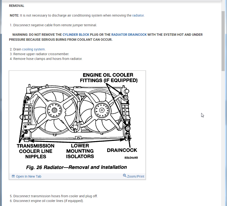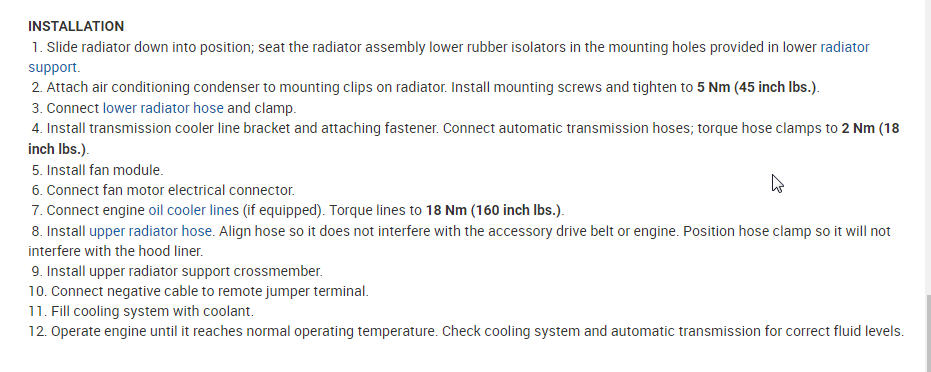 Keep in mind there are transmission cooler as part of the radiator so you are going to have to top off the transmission fluid as well. Here is the replacement process from the manual and it talks about this.