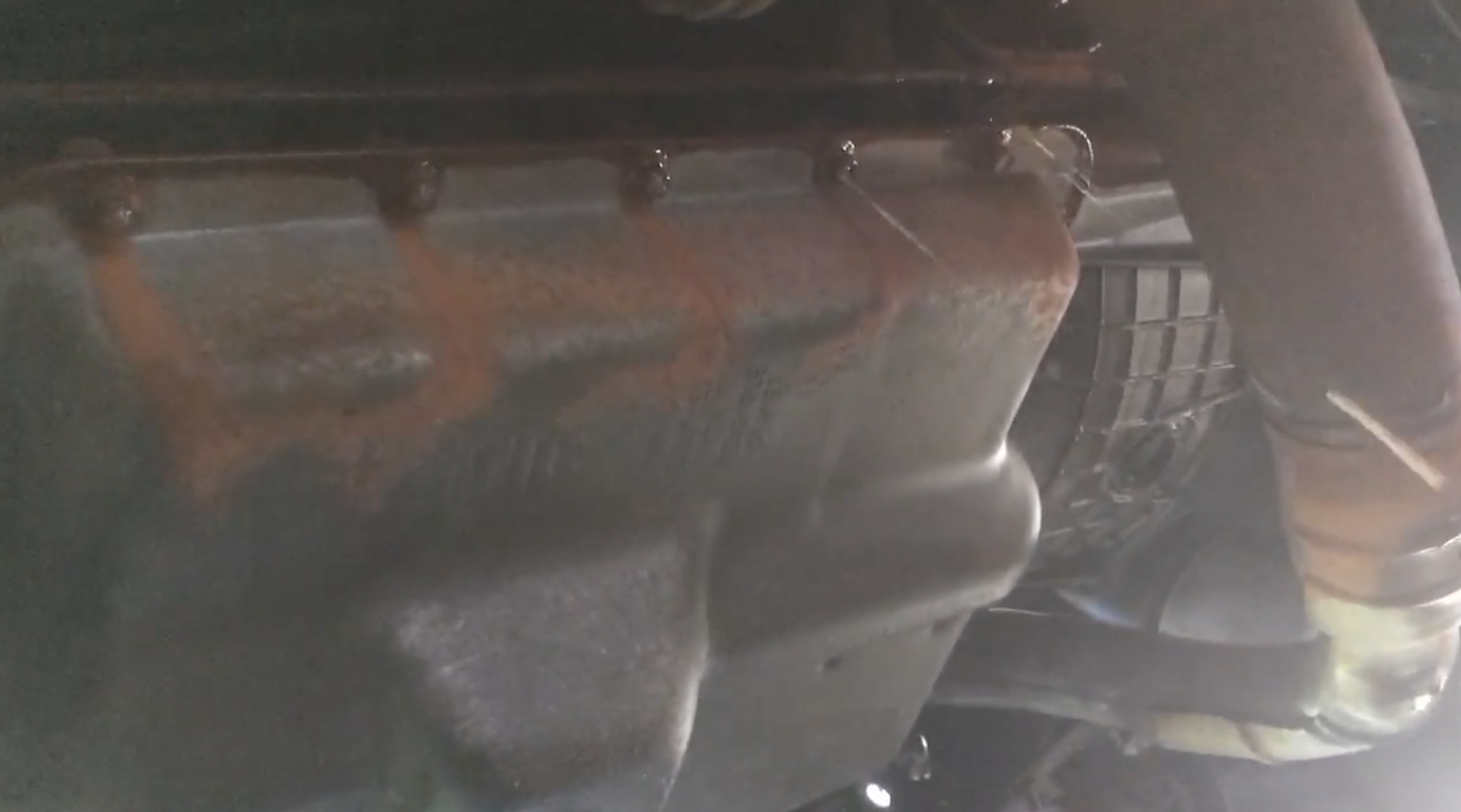 Noticed though that she is now leaking somewhere between the engine and the transmission pan. See image.