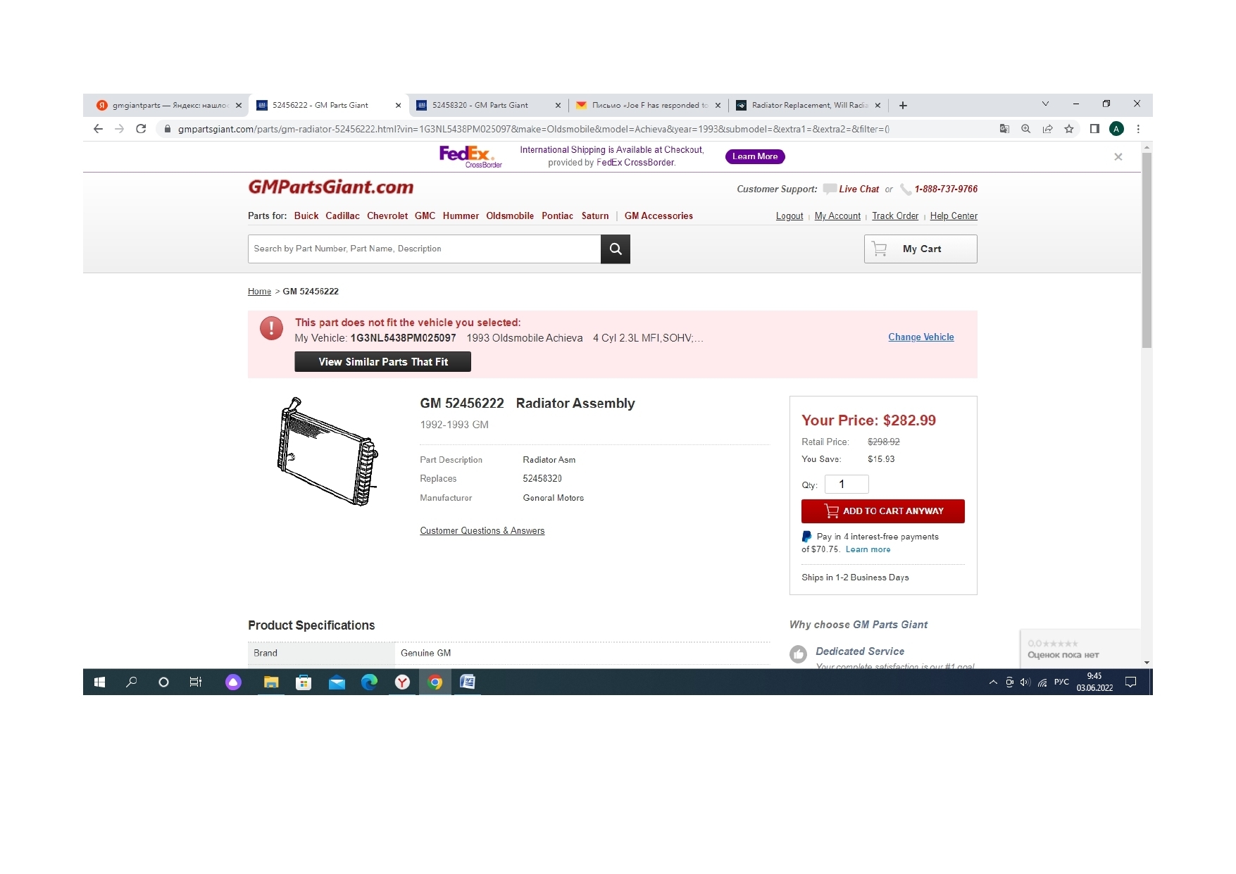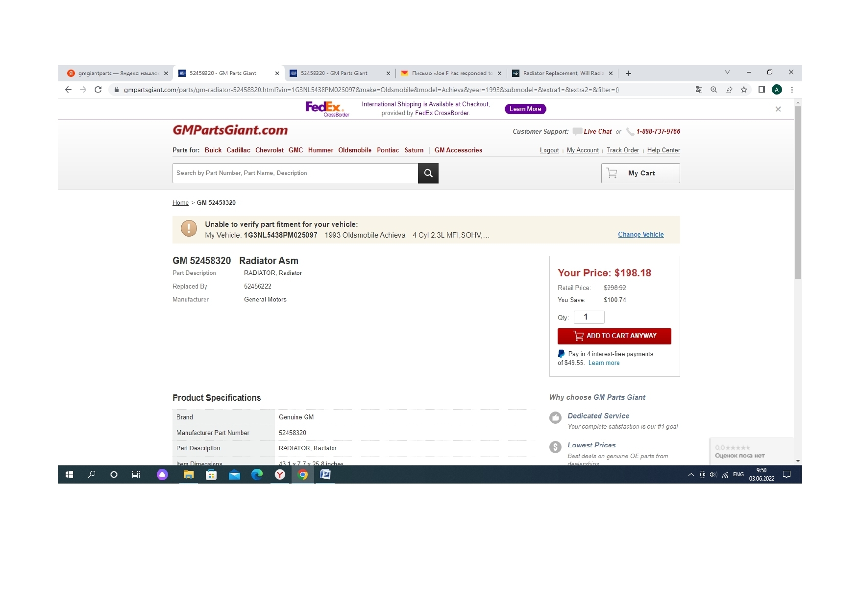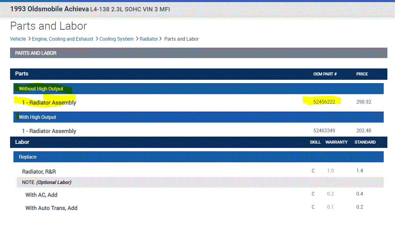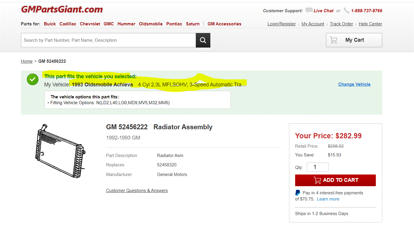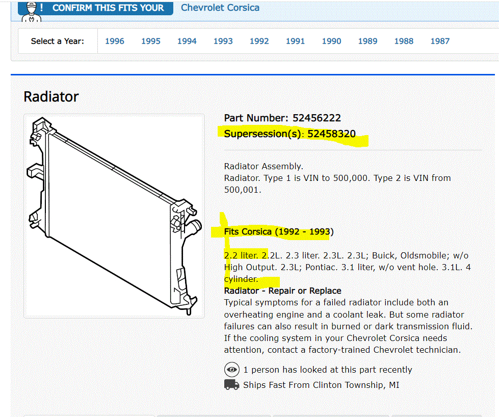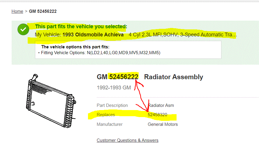 I am not located in the USA. I am planning to purchase and replace the engine cooling radiator assembly. I have very few offers. I can purchase a 52458320 (GM) radiator. But I am not sure if this radiator will fit my car. Unfortunately, the seller cannot provide a picture or photo of this radiator. Maybe you can advise if this radiator will fit my car. It would be great if you could provide me with a image of the 52458320 radiator from the hose connection side. My car listed above is an S, VIN 1G3NL5438PM025097, 2.3L L4 SOHC engine (VIN 3), TH125C transmission. Thanks in advance.