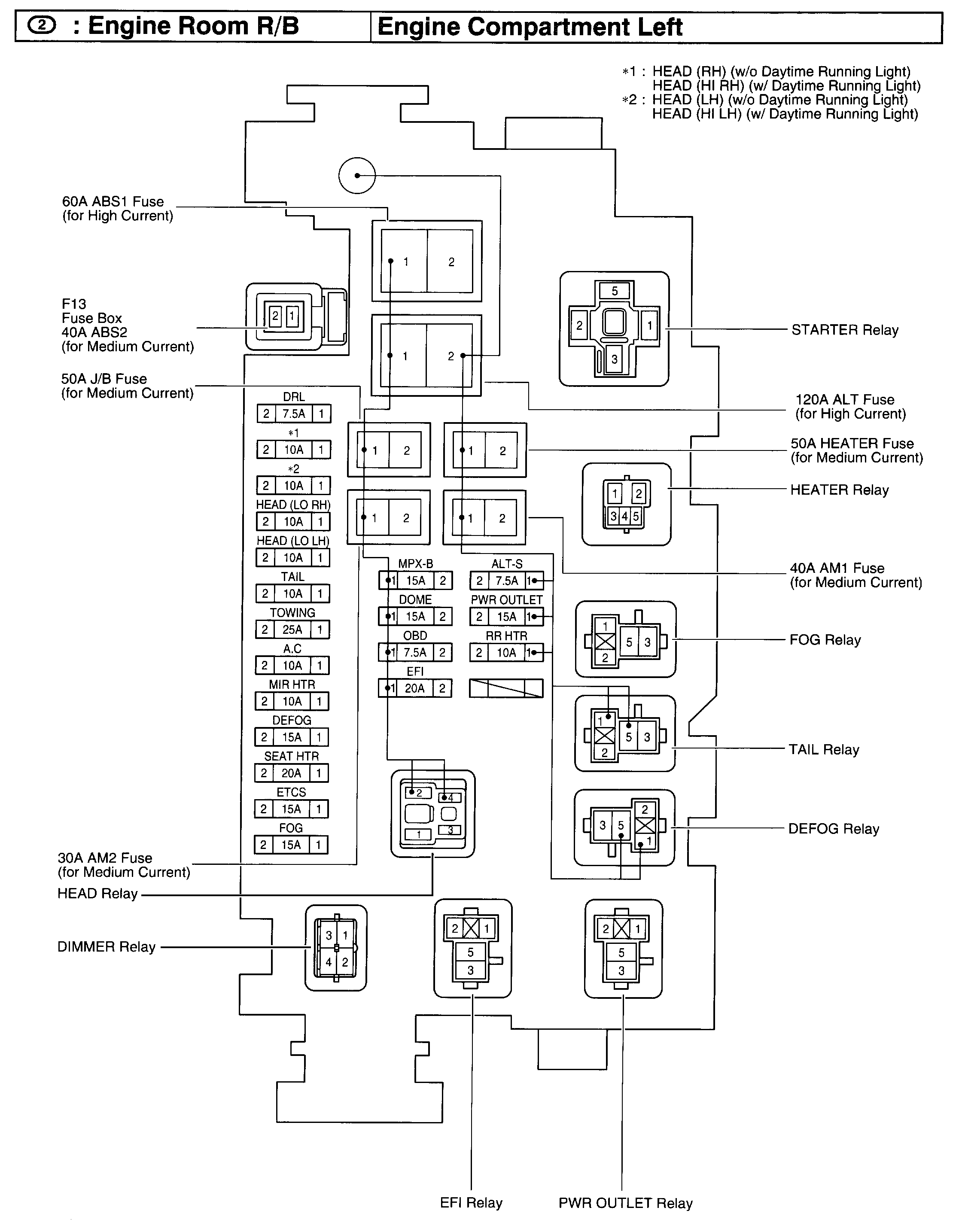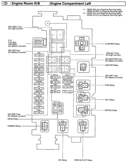 Here are the engine compartment and interior fuse box pictures. Just verify that you have 12 volts across them and replace if they are at all questionable.